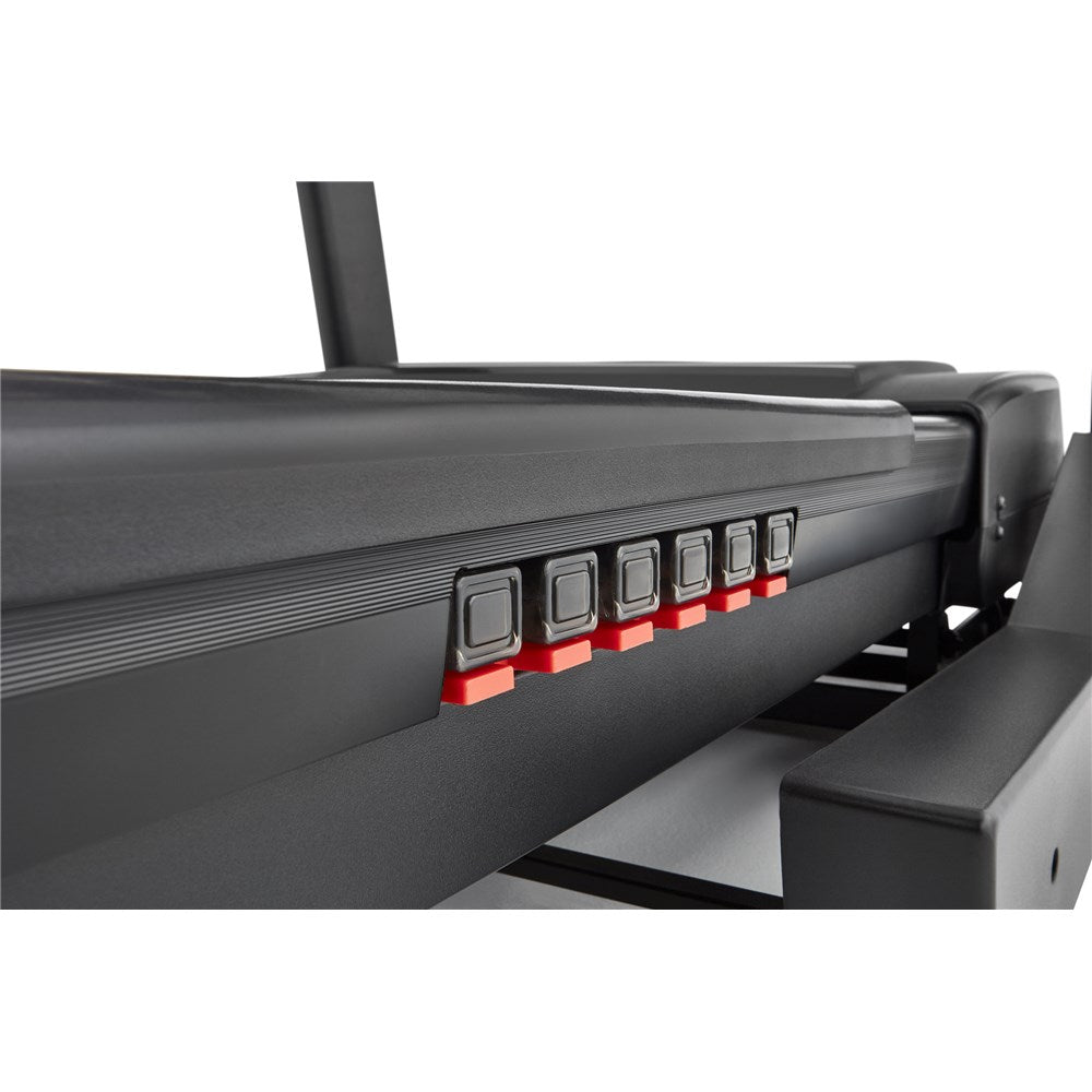 Hastighed og incline (hældning) indstilles nemt via knapper på display, hvor der allerede er placeret genvejs knapper, så du hurtigt kan komme op eller ned i fart og hældning. LCD display giver et hurtigt overblik over alle vigtige træningsdata her og nu. Pulsen aflæses "on time" og du kan sikre dig, at træningen foregår i egen valgte puls zone. Mp3 kan tilkobles og afspilles med fyldig lyd på de to 5Watt højtalere. Bliver det for varmt, kan luften nedkøles med den indbyggede vifte der sidder i display. Løbebåndet kan klappes sammen og ved hjælp at en lille hydrauliske fjeder, kan det gøres uden besvær. Når det skal ned igen, er der indbygget et "soft Close" system, der lader båndet dale roligt ned, så det ikke er til fare for nogen.